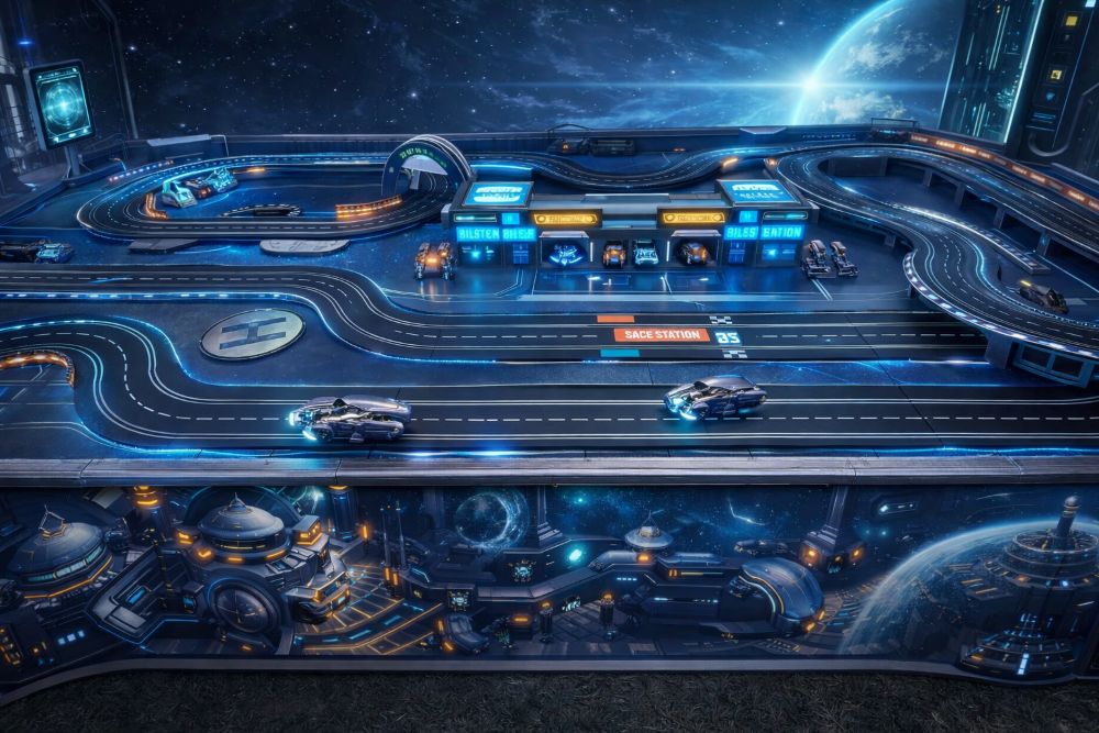 A Carrera autópályánk alapjainak átdolgozása egy űrbázis hangulatú versenypályára, ahol a futurisztikus technika, látványos dekoráció és az izgalmas verseny együttesen szórakoztatja a gyerekeket és a családokat. A pálya modern díszletekkel, galaktikus motívumokkal és látványos elemekkel lesz körülvéve, így a verseny nemcsak játék, hanem egy utazás az űr világába is.